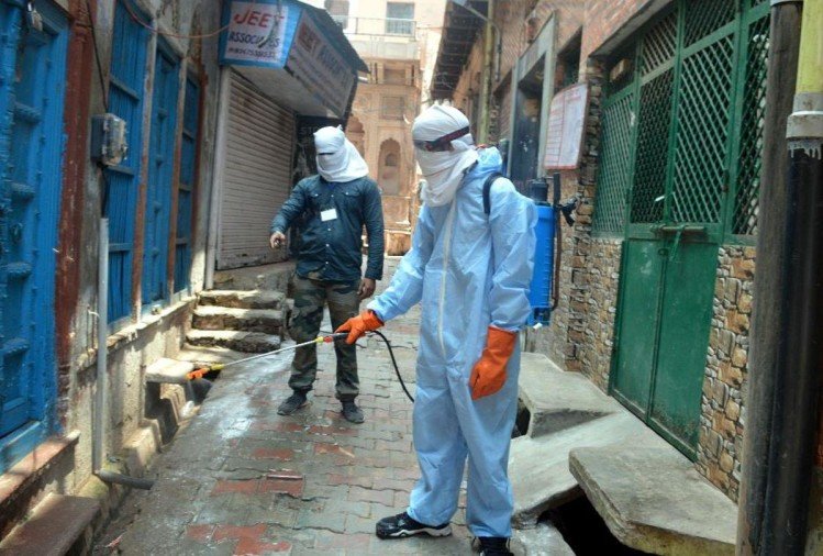 कोरोना पॉजिटिव मिलने के बाद इलाके को सैनिटाइज करता कर्मचारी