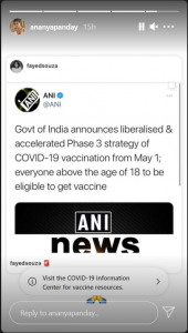 भारत में कोविद -19 मामलों में खतरनाक वृद्धि के साथ, कई हस्तियां भी इस महामारी से बाहर निकलने के बारे में चिंतित हैं। वे अपने सोशल मीडिया पहुंच का उपयोग जानकारी फैलाने के लिए करते रहे हैं जो लोगों को मददगार लग सकता है। जब सरकार ने घोषणा की कि 1 मई से 18 वर्ष से ऊपर के सभी लोग टीका के लिए पात्र होंगे, तो करीना कपूर खान और अनन्या पांडे जैसी अभिनेत्रियों ने इस खबर के बारे में आभार और उत्साह व्यक्त किया।