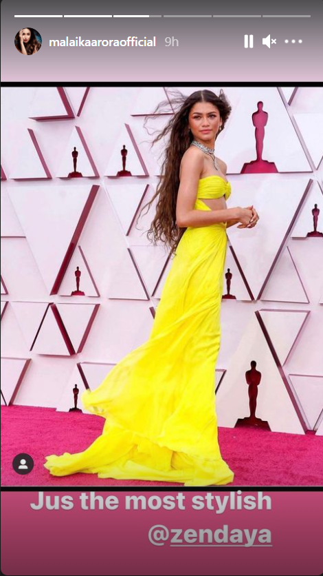 ज़ेन्डेया के हालिया लुक से भारतीय सेलेब इतने ज़्यादा प्रभावित हुए कि उन्होंने एक इंस्टाग्राम स्टोरी अमेरिकी स्टार को समर्पित कर दी। अपनी तस्वीर डालते हुए, मलाइका ने लिखा, “बस सबसे स्टाइलिश,” और उसे टैग किया।