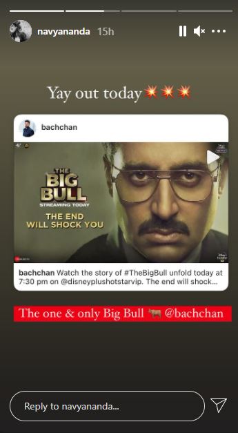 फिल्म के प्रीमियर से पहले, अभिषेक ने अपने आधिकारिक इंस्टाग्राम अकाउंट पर फिल्म के एक पोस्टर को साझा करने के लिए कैप्शन के साथ साझा किया था, “आज शाम 7:30 बजे द बिग बुल की कहानी देखें। अंत आपको चौंका देगा। ” नव्या ने अपने इंस्टाग्राम कहानियों पर पोस्ट साझा किया और लिखा, “आज बाहर,” जोड़ते हुए, “एक और केवल बड़े बुल अभिषेक बच्चन।”