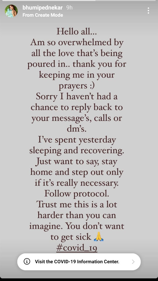 भूमि ने अपनी इंस्टाग्राम कहानियों को लिया और लिखा, “सभी को नमस्कार … क्या सभी प्यार से अभिभूत हैं … जो मुझे आपकी प्रार्थनाओं में रखने के लिए धन्यवाद देता है 🙂 क्षमा करें, मुझे आपके संदेश का उत्तर देने का मौका नहीं मिला, कॉल या डीएम की। मैंने कल सोने और ठीक होने में बिताया है। बस यही कहना चाहता हूं, अगर यह वास्तव में है, तो घर पर रहें और बाहर कदम रखें। प्रोटोकॉल का पालन करें। मुझे विश्वास है कि यह बहुत कठिन है जितना आप कल्पना कर सकते हैं। आप नहीं चाहते हैं। बीमार